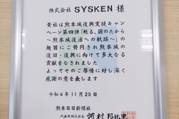 熊本城復興支援キャンペーンの感謝状をいただきました