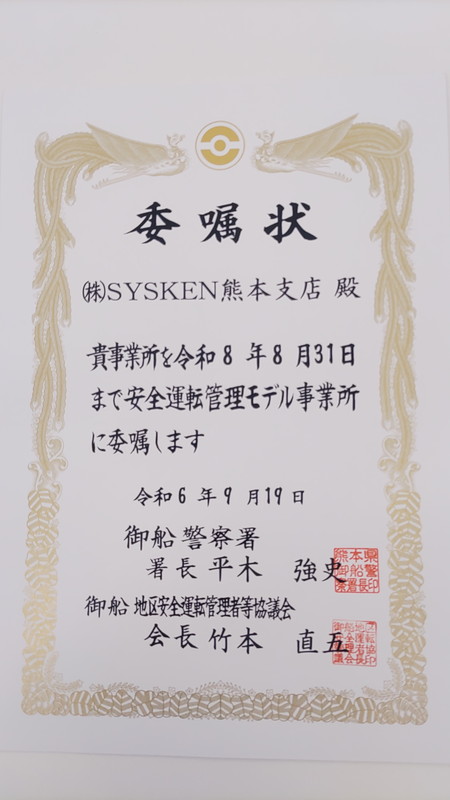 19 Sep 【熊本支店】「安全運転管理モデル事業所」に指定されました SYSKEN熊本支店は、令和6年秋の全国交通安全運動御船警察署管内4町合同出発式において、 益城町の「安全運転管理モデル事業所」の委嘱交付を受けました。 期間は2026年8月31日までの2年間です。 交通安全の推進に向け、気持ちを新たに取り組みます。