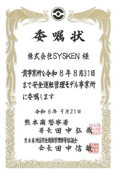4 Oct 【本社】「安全運転管理モデル事業所」に指定されました 熊本南警察署、熊本南地区安全運転管理者等協議会より 「安全運転管理モデル事業所」の委嘱交付を受けました。 (熊本南警察署管内600社の中から9社に委嘱) 期間は2026年8月31日までの2年間です。 交通安全の推進に向け、気持ちを新たに取り組みます。