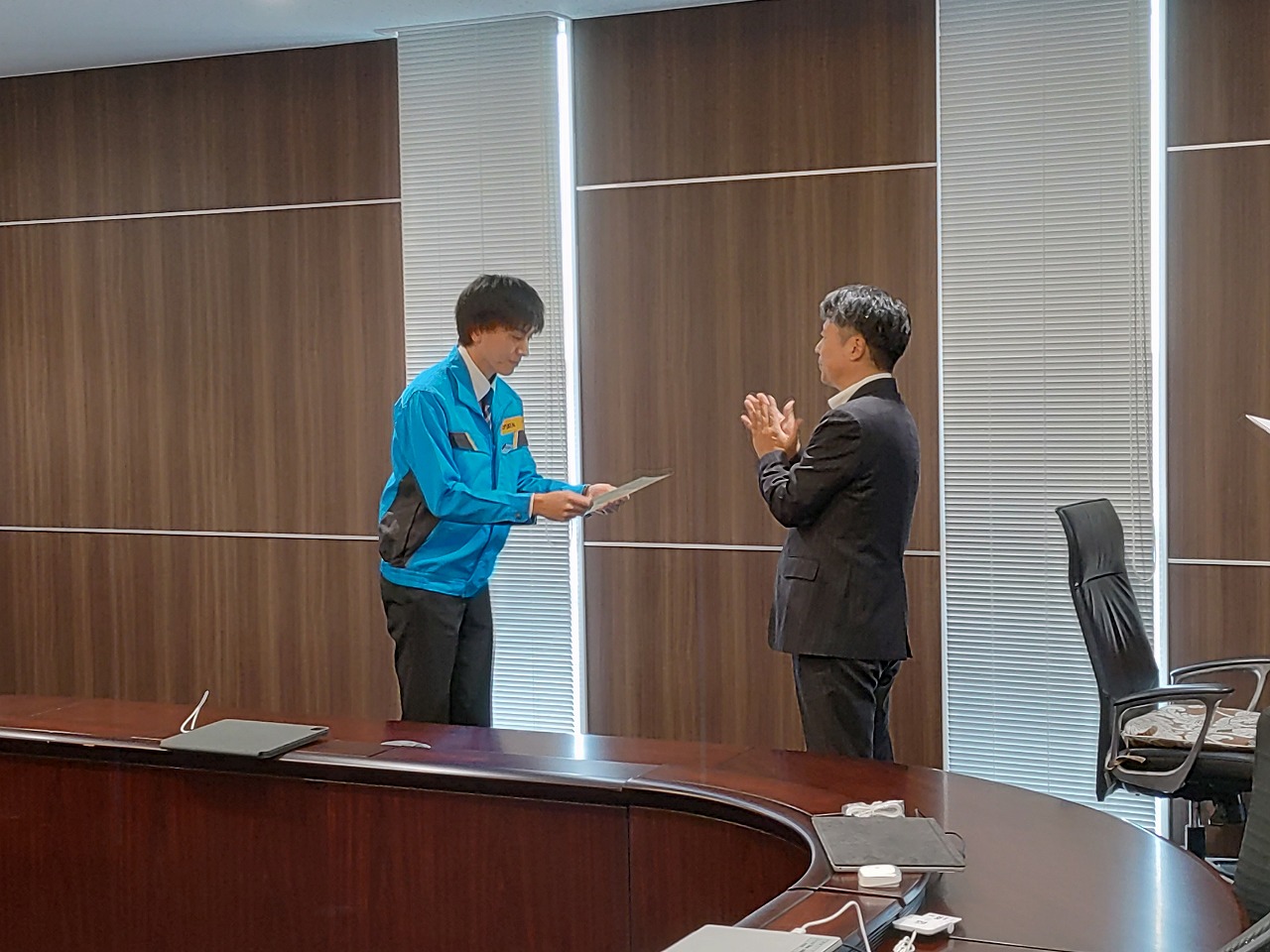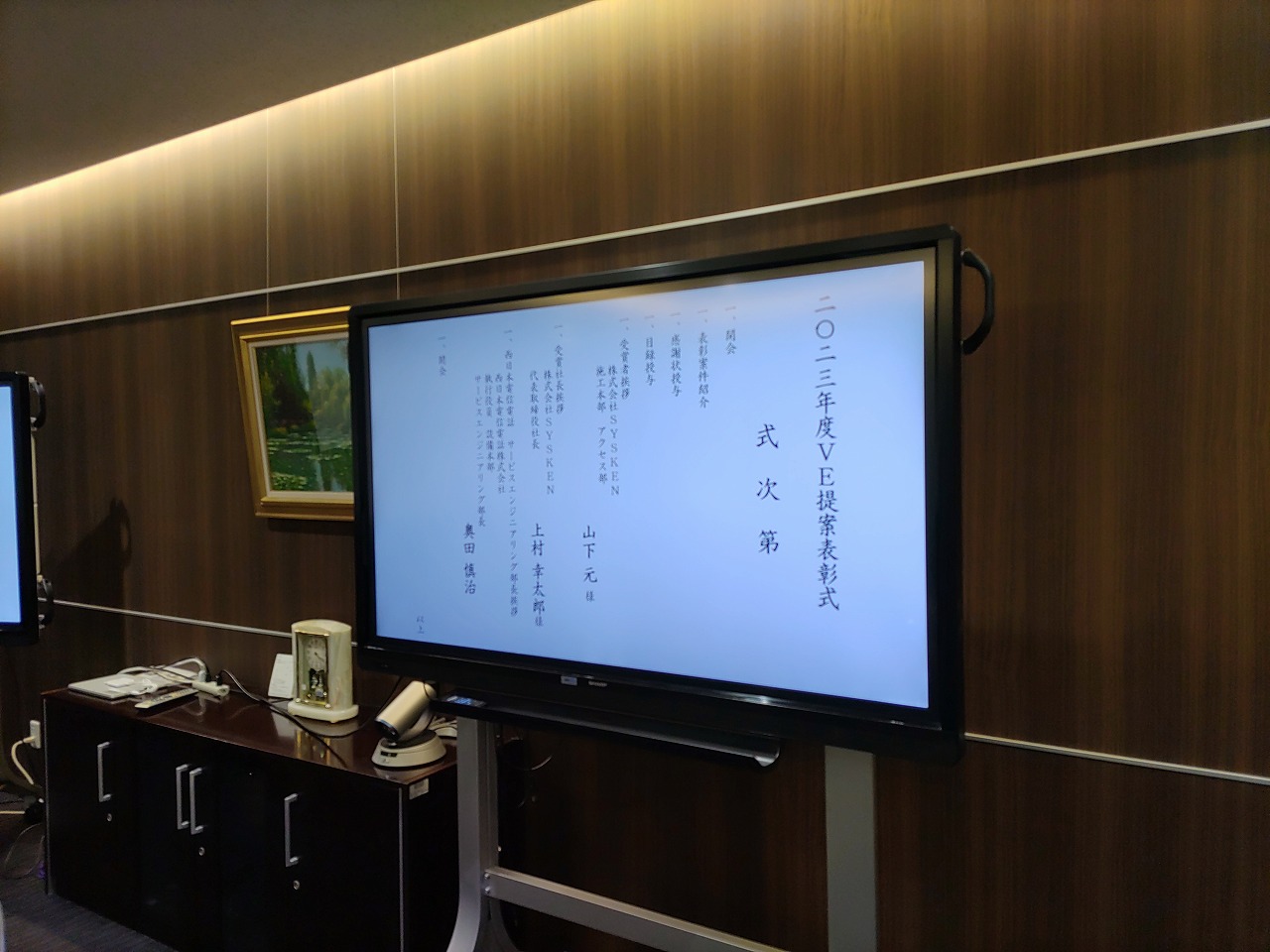 ◆表彰内容 「電柱番号札に記入する建設年度の廃止」 電柱番号札の取替え時間や材料費の無駄等、様々な無駄をなくす効果がある 【効果】 1.取替え時間・現場移動時間の削減 ・番号札の取替え作業がなくなり、時間の削減 2.材料費の削減 ・取替え作業の材料費(番号札等)削減 3.危険作業の軽減 ・番号札取替え時の高所作業が無くなる 上記の点が表彰されるポイントとなり、 「サービスエンジニアリング部長 奥田 様」より受賞 <受賞者> 施工本部 アクセス部 社員 提案者:品質総合センタ 施工品質部門 社員 VE提案におけるNTT様から今年度表彰は2社であり、 その1社となったことは大変光栄なことです。 今回の提案もパートナー会社様からの提案が基となり、 「VE提案」へ発展しております。 引続き「3S提案」システムを有効活用し、 積極的な改善を進めてまいりましょう。 技術開発部としても、現場で困っていることに関してスピーディな対応を心掛け、 今後も取り組んでまいります。