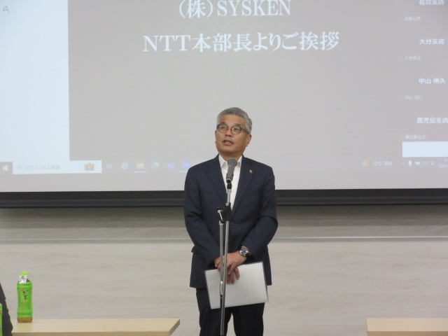 11月14日 (木)にNTT西日本情報機器の販売促進を目的として、 NTT西日本スマートビジネス営業部パートナー営業部門様及び 「NONフリーズ」のサプライヤであるテルウェル西日本株式会社様を講師としてお迎えし、 販売委託店及びSYSKEN販売担当者向けの研修会を開催しました。 今年も熊本をメイン会場とし、熊本以外の販売委託店様はSYSKEN各支店に お集まりいただく形式でのリモート開催となりました。 冒頭、大我NTT本部長より通建特約店11社の中で8期連続でNTT西日本より表彰を受けていることに対し 委託店様及び各支店販売担当者に感謝のお礼を述べるとともに、 下期の販売目標達成にむけてのご協力についてご挨拶をいただきました。 その後、上期情報機器販売で優秀な成績を収められた販売委託店・SYSKEN支店に対しての表彰式を開催し、 大我本部長より各社に感謝状と副賞を贈呈しました。 本年度上期のNTT情報機器販売の優秀表彰は以下のとおりです。 【情報機器販売賞】販売目標の達成率が最も高い会社・部門 Aグループ第1位 ・・・ ネットライフシステム株式会社(熊本) Bグループ第1位 ・・・ 合同会社平野通信システム(宮崎) Cグループ第1位 ・・・ 株式会社ジー・テック(佐賀) SYSKENの部第1位 ・・・ 販売統括部(福岡) 【情報機器販売貢献】販売額(NTT西卸価格)が最も高い会社・部門 Aグループ第1位 ・・・ ネットライフシステム株式会社(熊本) Bグループ第1位 ・・・ 有限会社TEL NET.ナガサキ(長崎) Cグループ第1位 ・・・ 株式会社ジー・テック(佐賀) SYSKENの部第1位 ・・・ 大分支店営業部 研修会においては、最初にNTT西日本ビジネス営業本部スマートビジネス営業部パートナー営業部門の日野部長様より、 九州の特約店の販売状況を中心にNTT西日本情報機器の販売動向についてご講演をいただきました。 引き続き商品セミナーとして、NTT西日本プロデュース担当の坪内主査より 新しいビジネスホン「αzXⅡ-S/M」の概要について、 また下期重点商材に追加しました「NONフリーズ」について テルウェル西日本の渡邉課長より導入事例も含めてご紹介をいただきました。 今回リモート会場も含めて49名の参加をいただき、有意義で充実した研修会となりました。