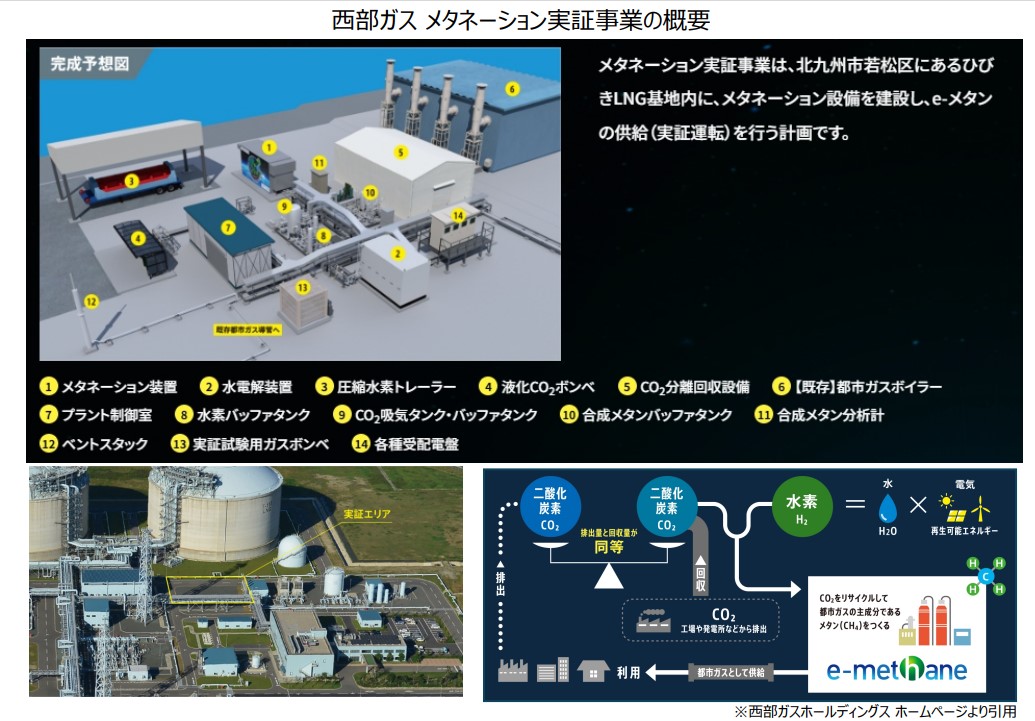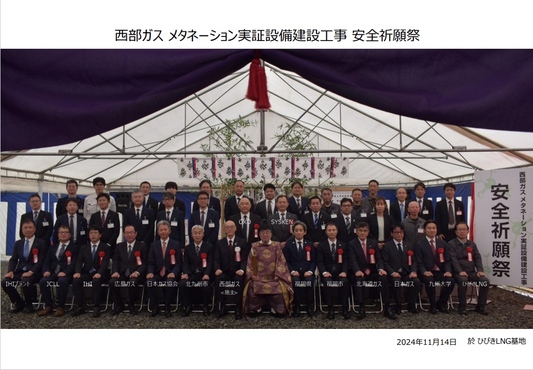 西部ガスメタネーション実証設備建設工事の安全祈願祭に参加しました。 北九州市若松区のひびきLNG基地での安全祈願祭には関係者が40人ほどが出席し、 上村社長が工事の安全を祈願して玉串を奉奠されました。 SYSKENは、ひびきLNG基地での カーポート及び野立て太陽光発電設備の提案及び構築・保守の実績が評価されて、 メタネーション実証設備建設工事の一部を発注いただいたものです。 本実証設備は、二酸化炭素と水素を組み合わせて都市ガスの原料となる メタンを合成する技術「メタネーション」により、「e-メタン」の製造コスト低減と 環境価値提供の実用化を目指すものです。 九州独自の地産地消モデルによるカーボンニュートラルへの取り組みに貢献するとともに、 GXソリューションを推進していきます。 ※安全祈願祭の集合写真及びメタネーションの概要を添付しています。