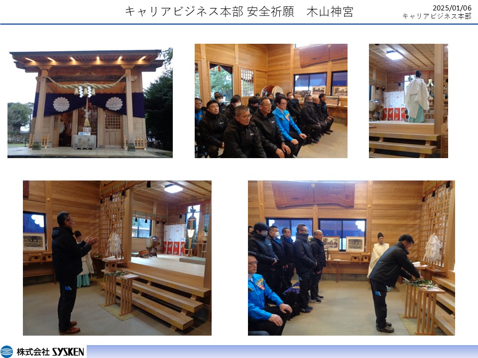 6 Jan 【キャリアビジネス本部(益城)】2025年安全祈願 木山神宮にて2025年の安全祈願を行いました。 本年も無事故でSYSKENの業績に貢献できるよう、 キャリアビジネス本部一丸となり業務に励んでいきます。