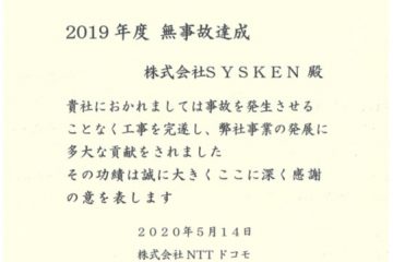 NTTドコモ様より無事故達成の感謝状を頂きました