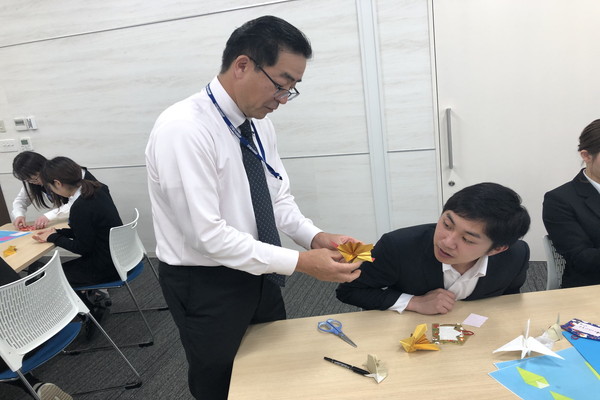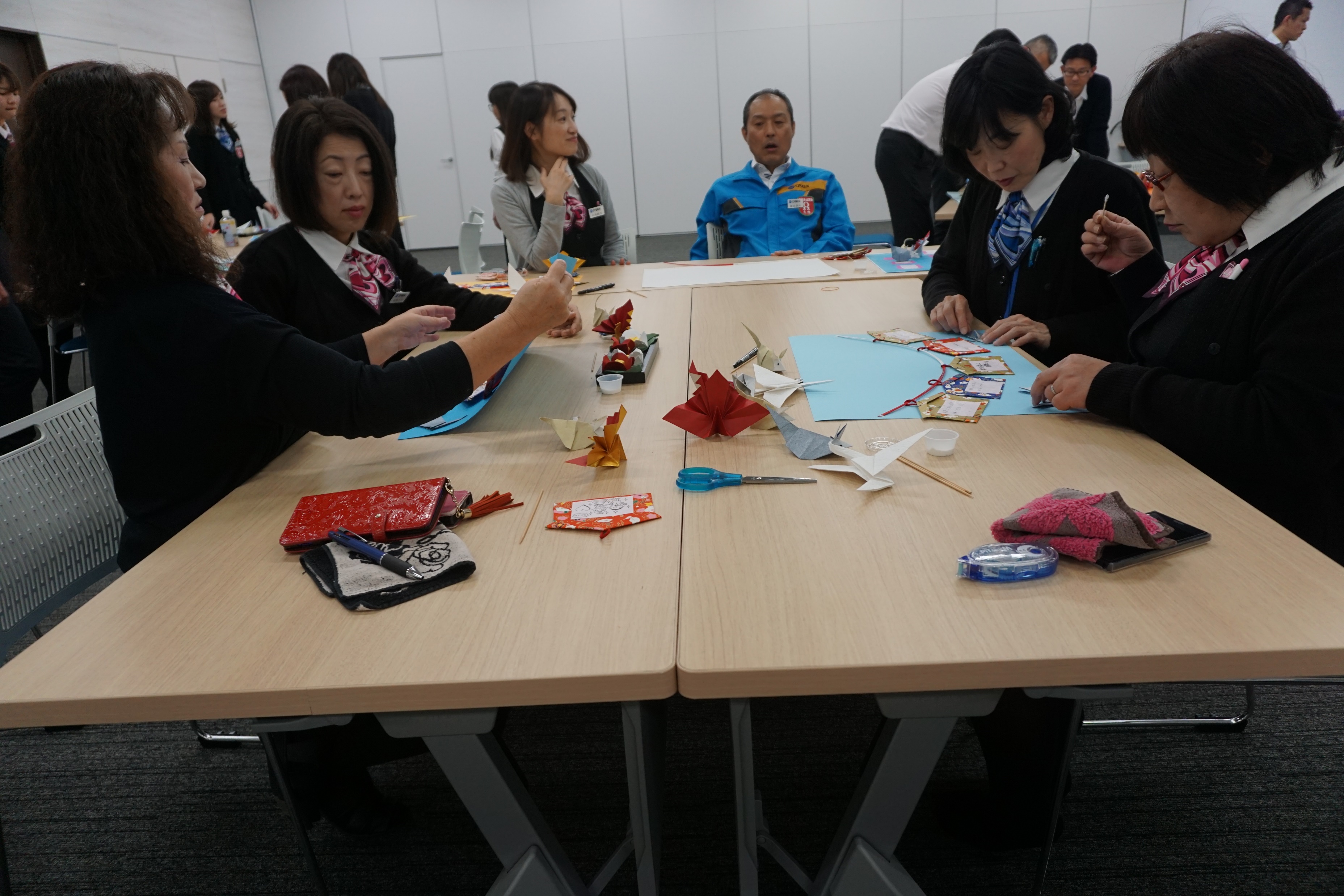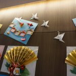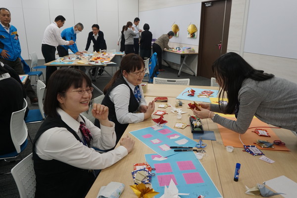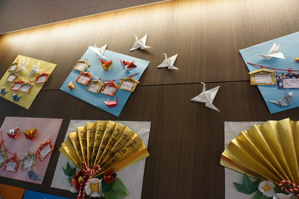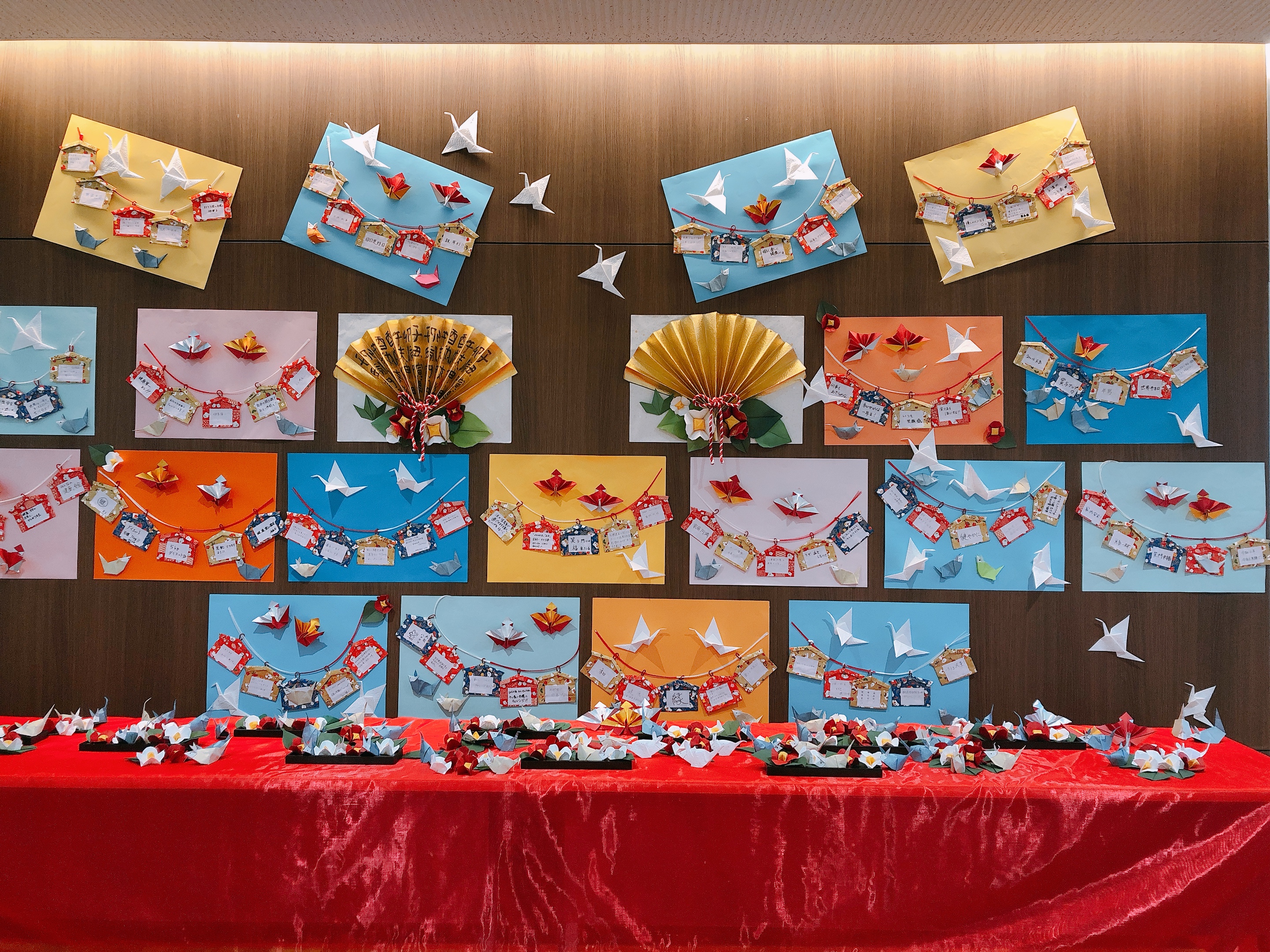 2020年度の正月飾りは、干支の子(ねずみ)と今年の抱負を書いた 絵馬と椿の花を社員が折り紙で制作しました