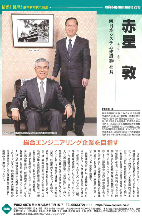 「クローズアップ熊本2010 ~情熱!挑戦!新時代へ前進~ 熊本を引っ張る129人の熱きリーダーたち」と題して、赤星社長のメッセージが268頁に掲載されました。柏尾副社長と一緒に撮った写真も掲載されています。