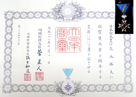 1 Jul 弊社OBが「瑞宝双光章」を叙勲 髙本保夫氏(元 品質管理部次長)が、平成22年7月1日に「瑞宝双光章」を授与されました。「瑞宝双光章」は、公務等に長年にわたり従事し、功績を残された方に授与されるものであります。