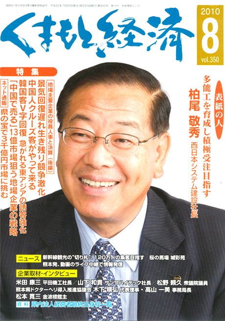 30 Jul くまもと経済8月号に掲載されました。 「多能工を育成し積極受注目指す」と題して、8月号の表紙に柏尾社長の顔写真が掲載されました。また、「柏尾新体制スタート」と題して、柏尾社長のメッセージが121頁から131頁に掲載されています。
