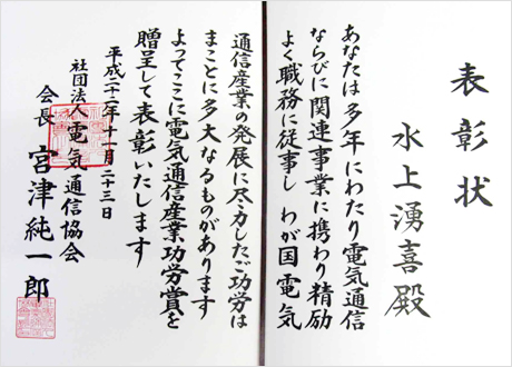 23 Nov 弊社OBが「電気通信産業功労賞」を受賞 水上湧喜氏(元 総合設備事業本部 技術部次長)が、平成22年11月23日に「電気通信産業功労賞」を受賞されました。「電気通信産業功労賞」は、電気通信関連事業の発展に大きく貢献された方に授与されるものであります。